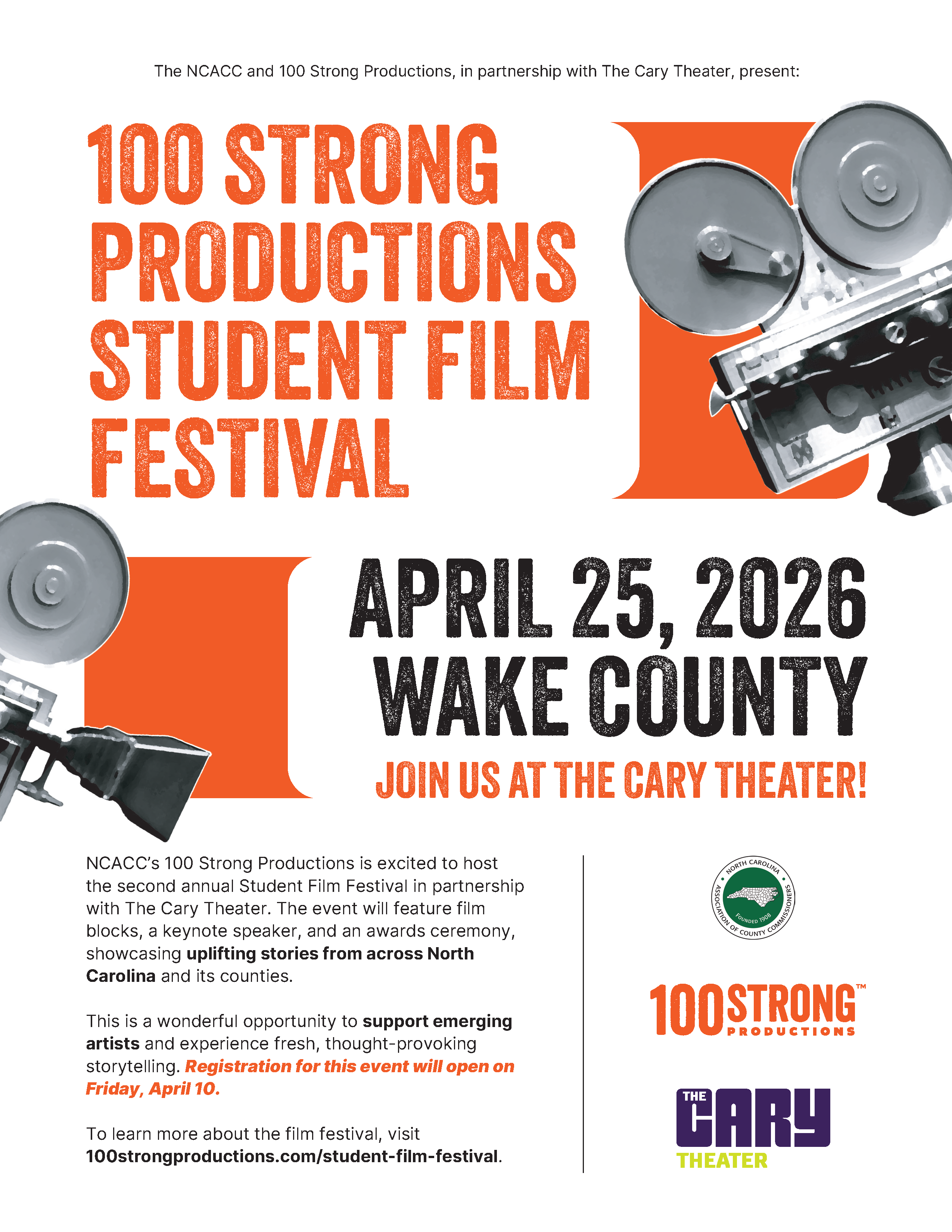 Lights, camera, action! NCACC’s 100 Strong Productions is excited to host the second annual Student Film Festival in partnership with The Cary Theater. The event will feature film blocks, a keynote speaker, and an awards ceremony, showcasing uplifting stories from across North Carolina and its counties. This is a wonderful opportunity to support emerging artists and experience fresh, thought-provoking storytelling. Registration for this event will open on Friday, April 10.