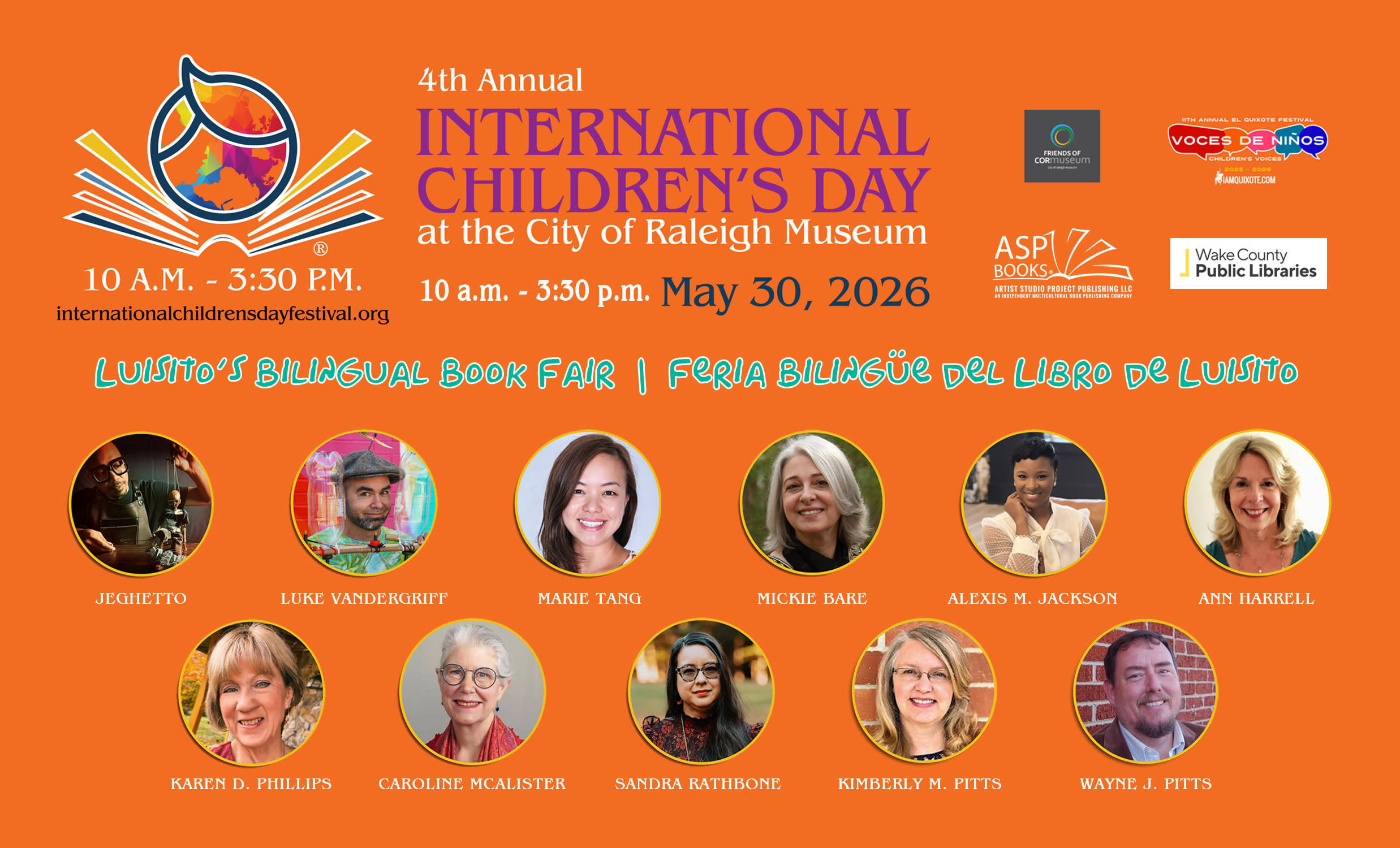 The 4th Annual International Children’s Day Festival & Luisito’s Bilingual Book Fair | Feria Bilingüe del Libro de Luisito is presented in collaboration with Friends of the City of Raleigh Museum, Wake County Public Libraries, and Artist Studio Project Publishing (ASP Books) as part of the 11th Annual El Quixote Festival.