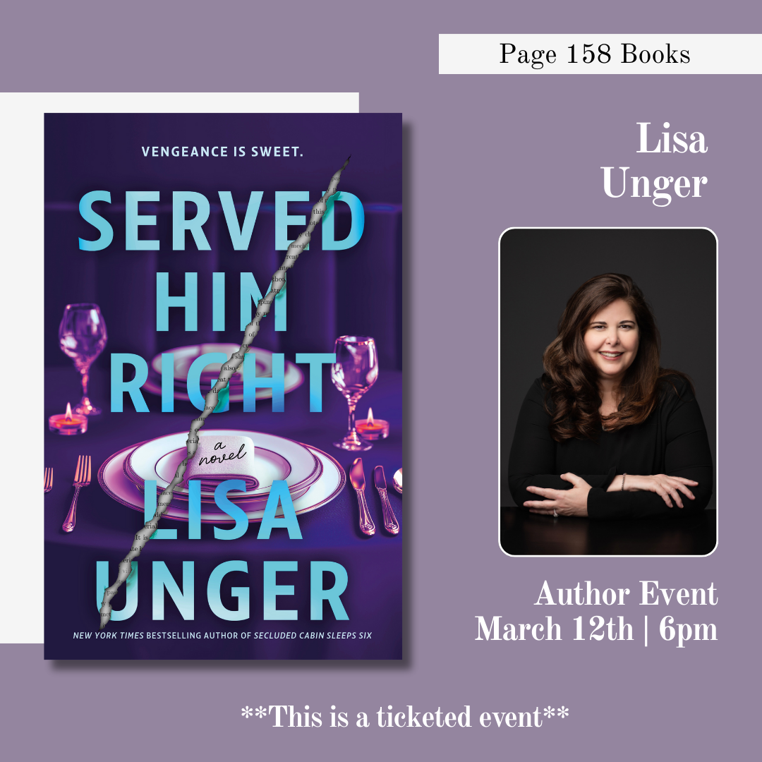 Join Page 158 Books as we welcome best-selling author Lisa Unger to celebrate her new novel, Served Him Right.