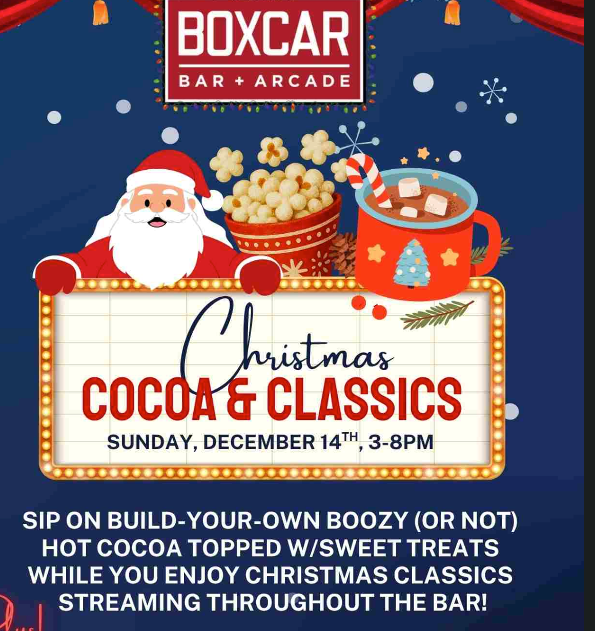 Sip on build your own boozy or not hot cocoa topped with sweet treats while you enjoy Christmas classics streaming through the bar.