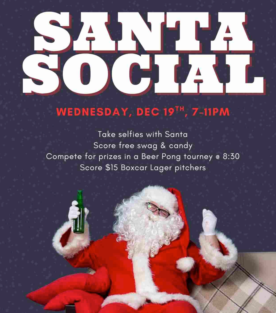 Take Selfies with Santa. Score free swag & candy. Compete for prizes in a Beer Pong tourney @ 8:30pm