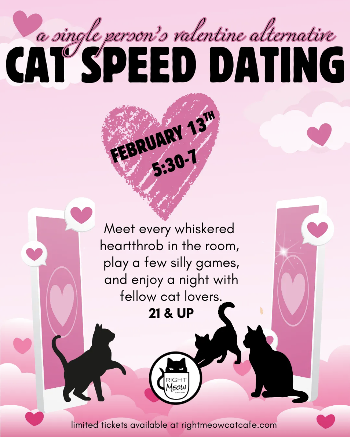 Looking for love this Valentine’s? Skip the awkward small talk and come to our Cat Speed Dating. Sip your latte, meet fellow single cats, and let them do what they do best: judge your lap-sitting skills, swipe at your hair, and occasionally grace you with a nose boop. Will it be a shy tabby or a flirty panther that steals your heart? Either way, expect purrs, playful chaos, and maybe a little feline-approved romance. Come for the cats, stay for the sparks… and the cat hair on your shirt. Who knows, you might make some new cat enthusiast weirdo friends too.