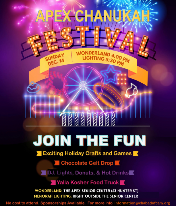 The Chanukah Festival is an event organized by the Chabad of Cary and celebrates the beginning of the Jewish eight-day festival of lights, Chanukah. This event features games, crafts, and food, and ends with lighting a menorah on Town Campus.