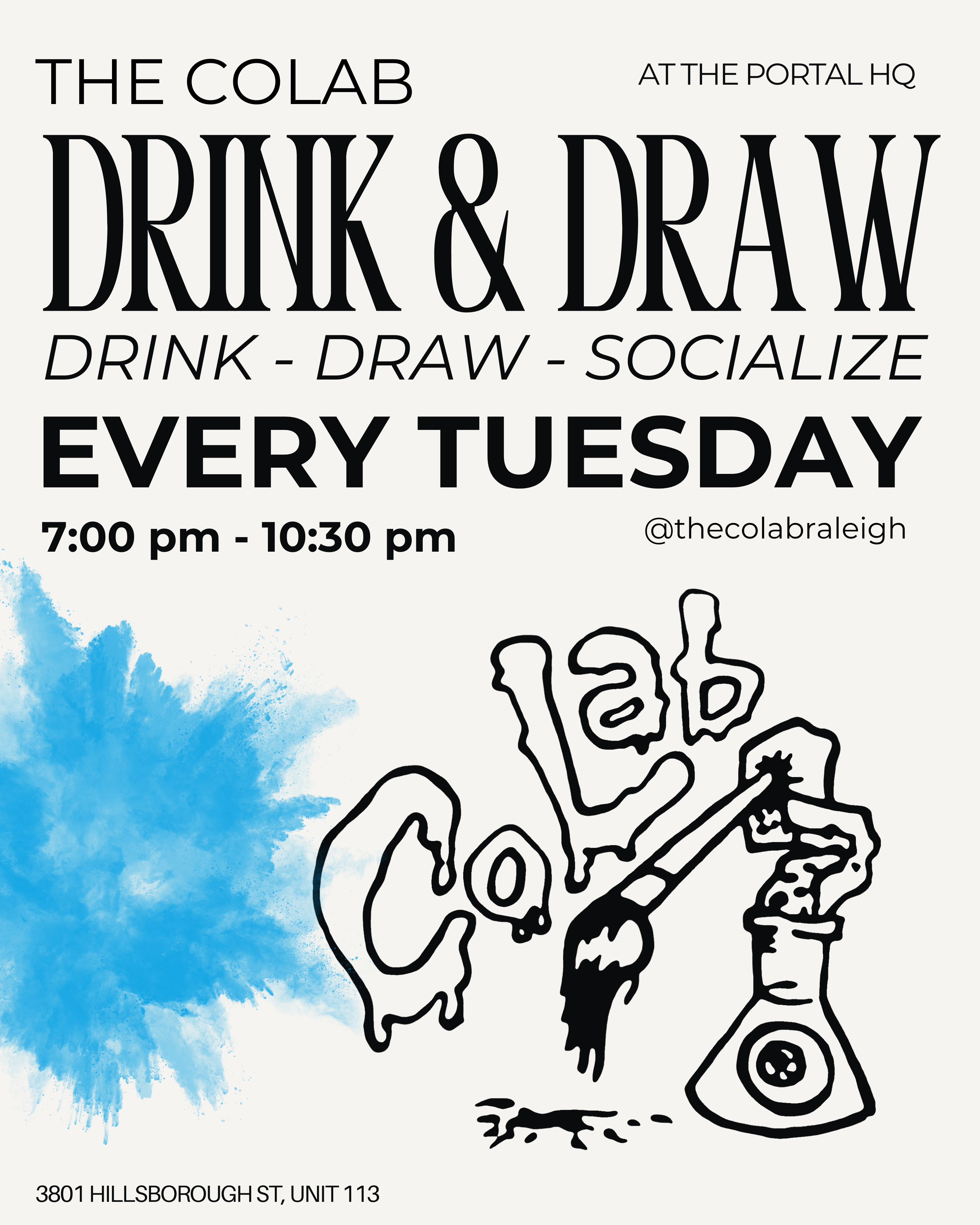 Drink & Draw takes place every Tuesday! Our foundation is rooted in collaborative making. We advocate for visual artists at all experience levels by nurturing both individual and communal progress.