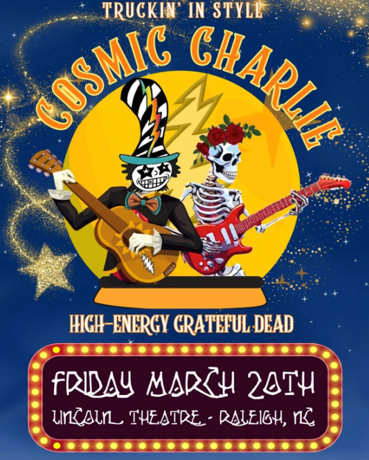 Cosmic Charlie - they focus on the music of the Grateful Dead, especially from the 1960s and 70s. Famous for playing without setlists, letting the music "play the band" and welcoming fan requests. They bring a fresh, energetic, and creative approach, aiming for those peak synchronistic moments found in live Dead shows.
