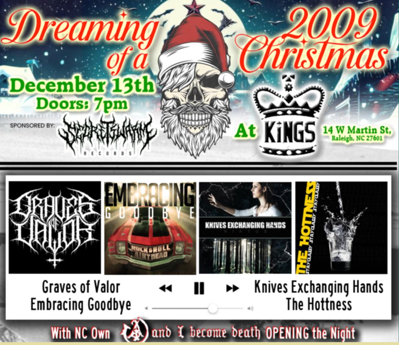 What is this… 2009? A crazy trifecta: Knives Exchanging Hands, Embracing Goodbye, and The Hottness are all reuniting for one special night in Raleigh! Graves of Valor and And I Become Death open it up.