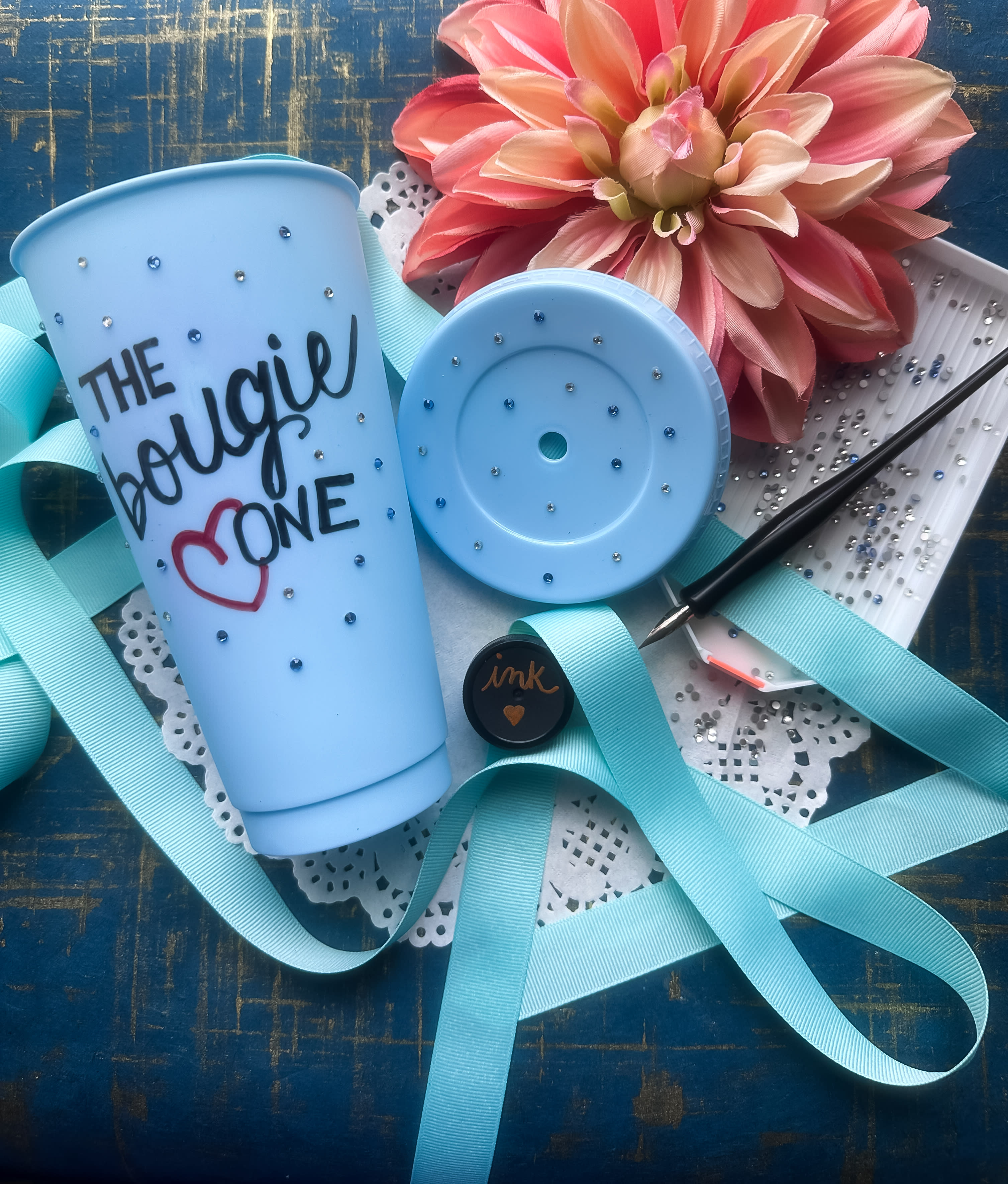 Class includes 1.5 hours of instruction and demonstration, our beginner’s calligraphy kit (two nibs, black ink pot, 2 letter guides, tracing paper, and straight pen holder), and all materials to write on. Everything is yours to keep at the end of the workshop. Additionally, we will be lettering on a 24 ounce plastic tumbler and adding a little bling with rhinestones!