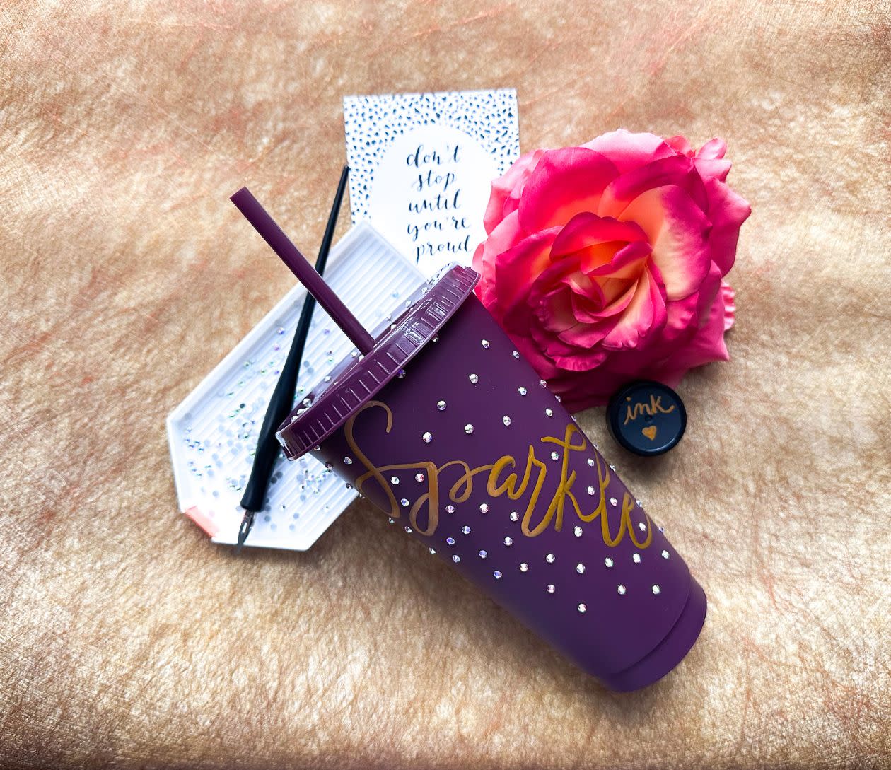Additionally, we will be lettering on a 24 ounce plastic tumbler and adding a little bling with rhinestones!