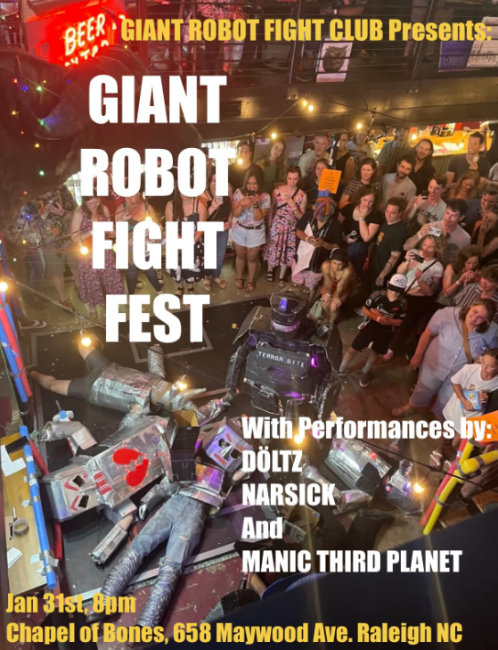 For the first time, the cult-hit show expands with the debut of GIANT ROBOT FIGHT FEST, featuring live performances from some of the Triangle’s best punk bands: Doltz, Narsick, and Manic Third Planet. Get ready for chaos, creativity, and an unforgettable night of robot mayhem and high-energy music.