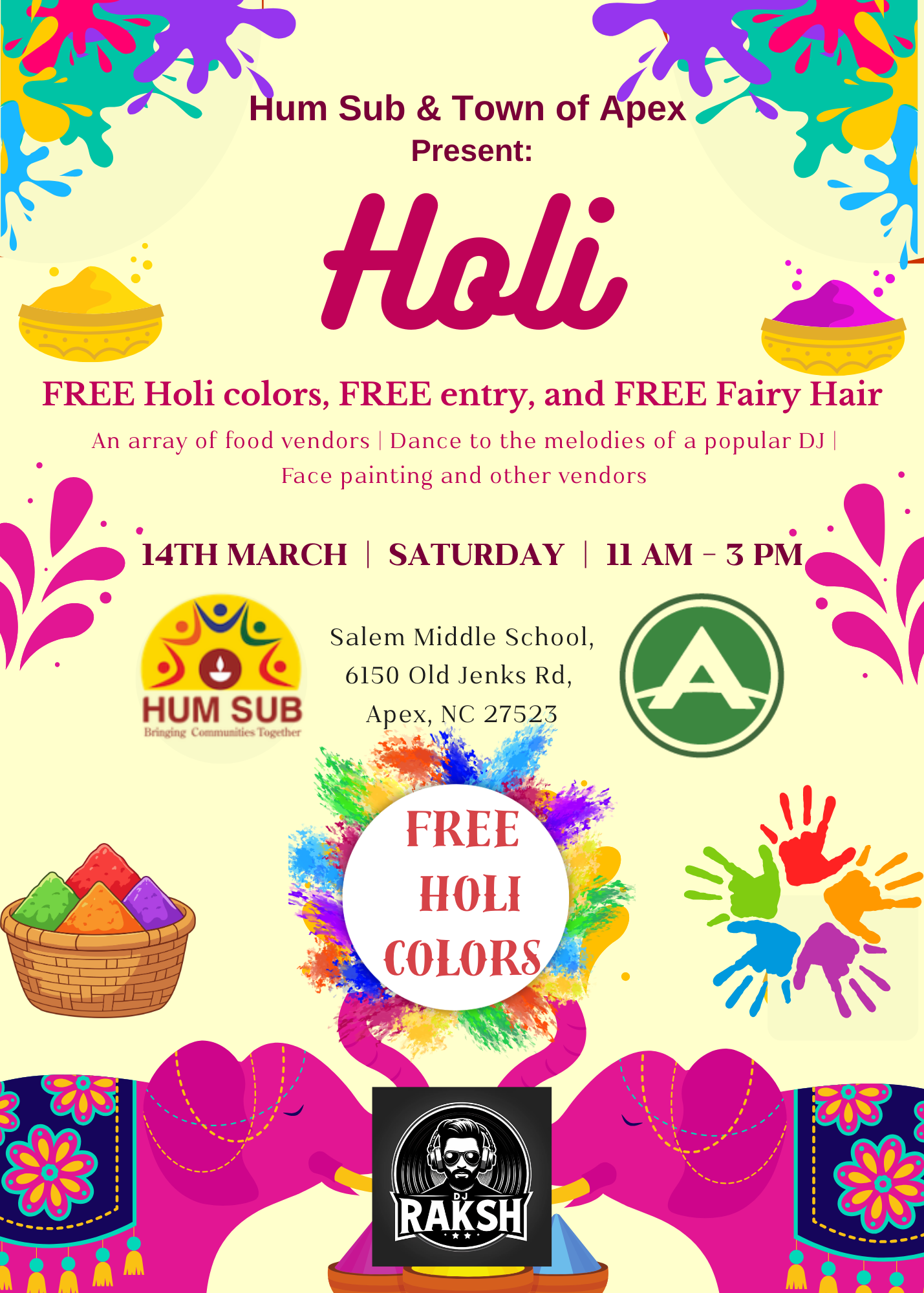 Apex Holi 2026 – Festival of Colors. Get ready to welcome spring with joy, color, and community spirit! Join us for Apex Holi — a celebration of the Festival of Colors! Come splash vibrant colors, enjoy music, delicious food, and fun activities for all ages.