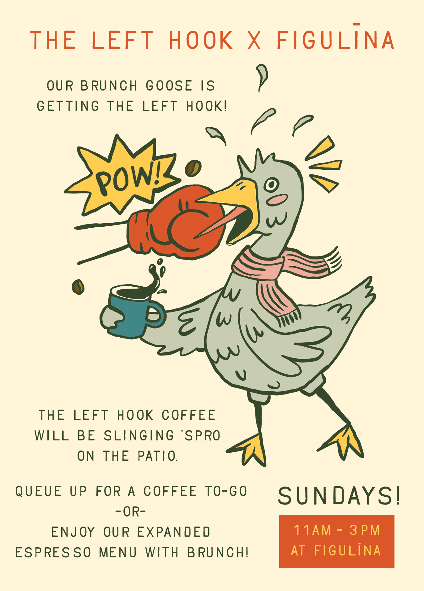 Get your Left Hook Coffee fix while we wait for their brick-and-mortar location to open. Every Sunday in November, Left Hook will be popping up on the patio at Figulina during Sunday brunch from 11am to 3pm. Come for to-go espresso or enjoy our expanding espresso menu with Figulina’s Sunday brunch menu.