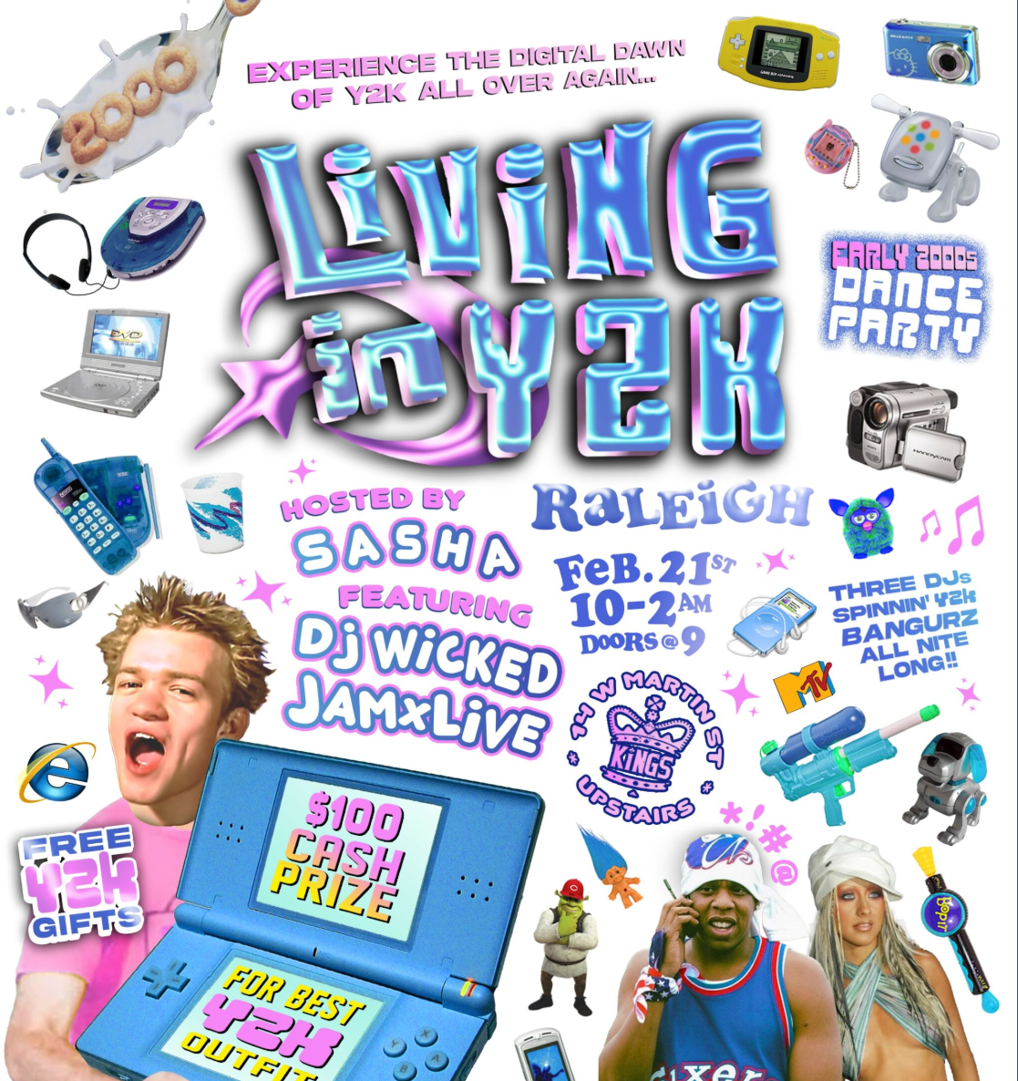 The best Y2K Party in the USA is back in Raleigh. Nothing but the best throwback hits and remixes spinning all night long. A Costume Contest with Cash Prize. Free Y2K Gifts & Candy, and much more. DJs: S A S H A, DJ WICKED, and JAMXLIVE