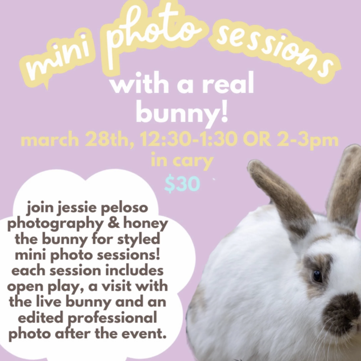 Join Jessie Peloso Photography and Honey the Bunny for a styled mini photo session! Each 1-hour session includes Open Play, a visit with Honey the Bunny (yes, an actual bunny) and a professionally edited photo, which you'll have access to after the event. Choose from one of two sessions and come for some fun!