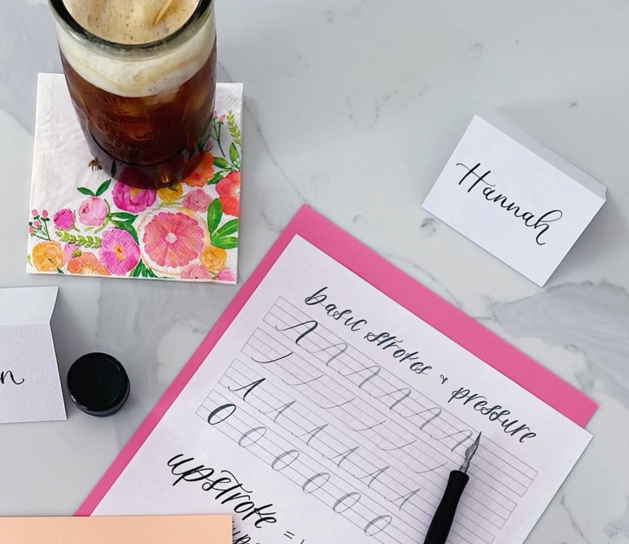 Class includes 1.5 hours of instruction and demonstration, our beginner’s calligraphy kit (two nibs, black ink pot, 2 letter guides, tracing paper, and straight pen holder), and all materials to write on. Everything is yours to keep at the end of the workshop!