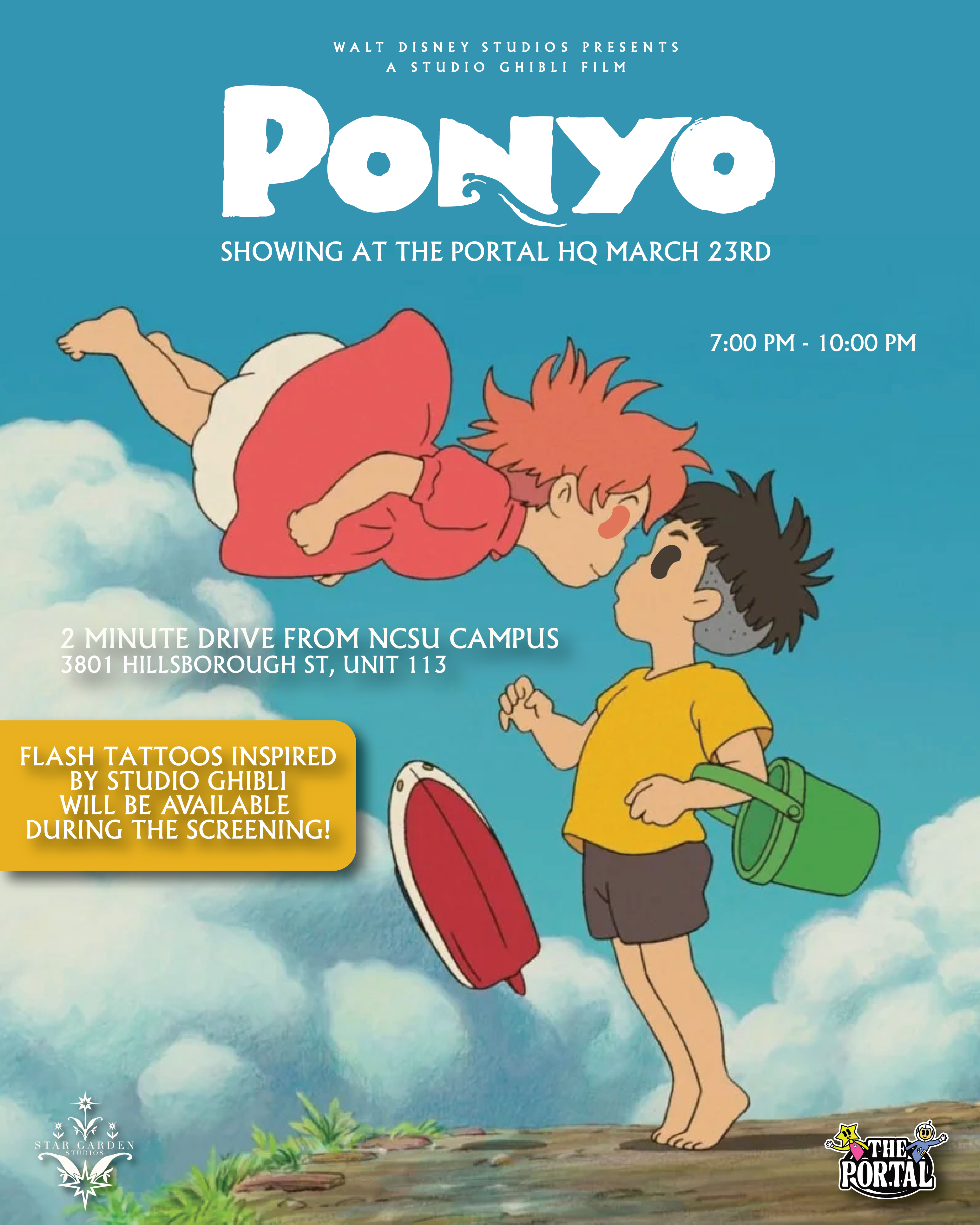 Join us for a screening of Ponyo on our 400+ squarefoot projection wall! This showing will also feature a flash tattoo artist experience with art inspired by Studio Ghibli.