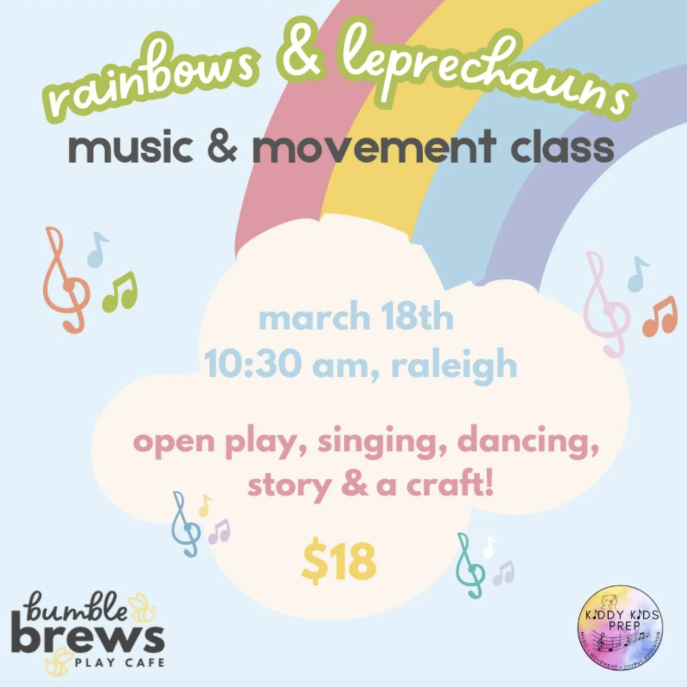 Join us for our March edition of our popular music and movement class at Bumble Brews Raleigh with Kiddy Kids Prep! The class is designed to encourage singing, dancing, and feel-good fun for our little ones (and grown-ups, too!).