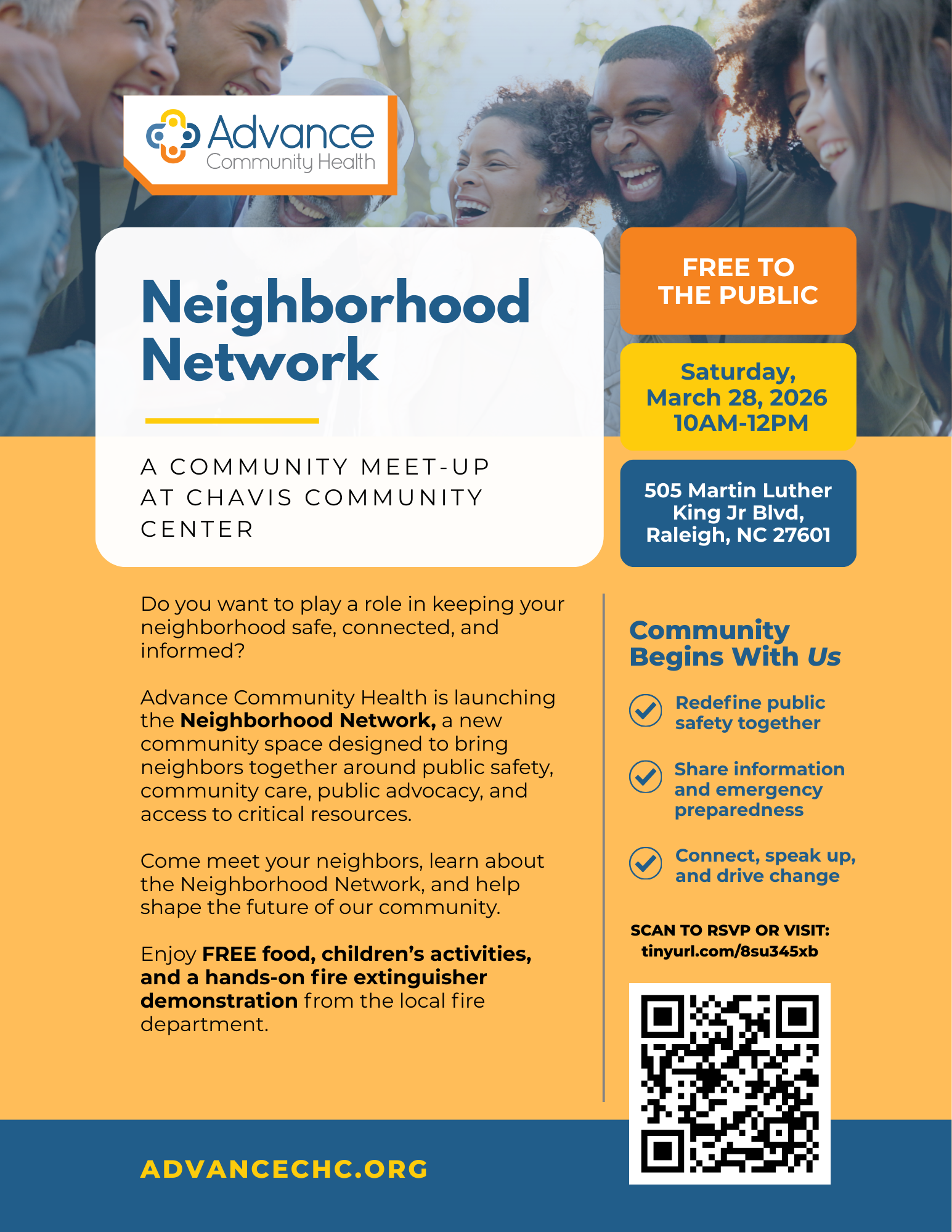 Advance Community Health is launching the Neighborhood Network, a new community space designed to bring neighbors together around public safety, community care, public advocacy, and access to critical resources. Come meet your neighbors, learn about the Neighborhood Network, and help shape the future of our community. Enjoy free coffee and pastries, children’s activities, and a hands-on fire extinguisher demonstration from the local fire department.