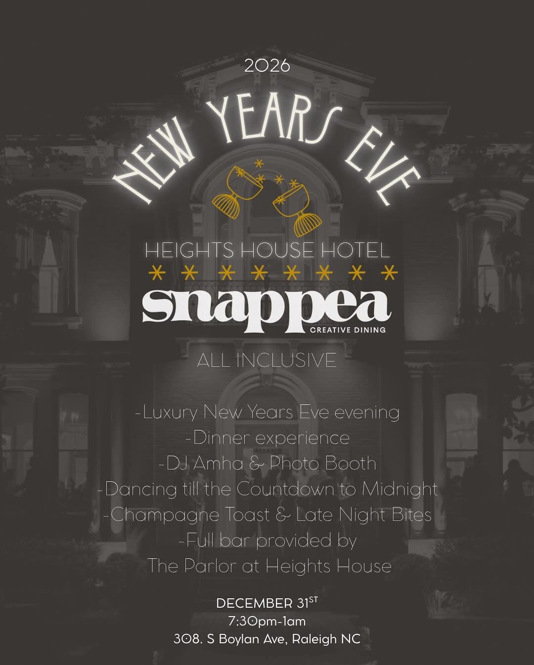 🔑 Complete the experience with an overnight stay at Heights House Hotel. Call (919) 594-1881 to book. Overnight stays on NYE require an event ticket