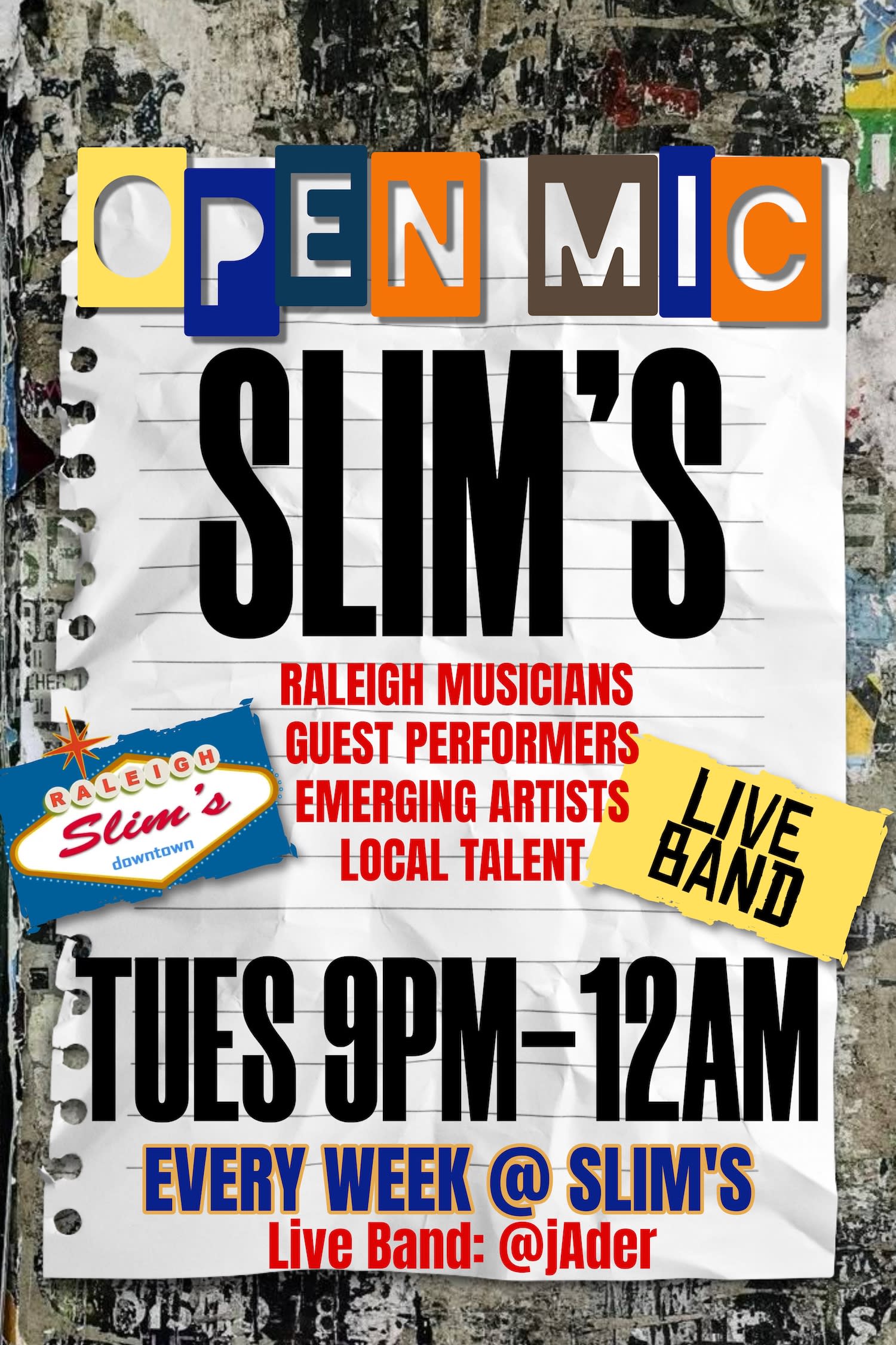 Every Tuesday: Open Mic with a Live Band - take the stage backed by a full live band of incredible local musicians. Singers sing a cover or showcase your original song. Instrumentalists can jump in on guitar, bass, drums, or keys. Bring your own instrument! We’ve seen everything from tubas, sax, trumpet, etc. Plus, poets, freestylers, or other performers are welcome! All styles, genres, and experience levels encouraged! At Slim’s!