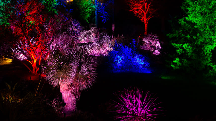 In the annual event "Moonlight in the Garden," the JCRA is decorated with an elaborate design of garden lighting that beautifully highlights the garden's key botanical features. It is a magical time to visit the gardens, but it can be challenging to capture in a photograph if you are not used to nighttime photography.