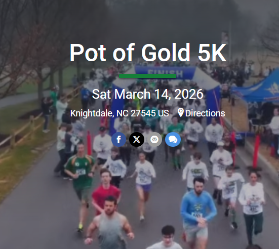 Join the excitement at the 8th Annual Pot of Gold 5K on Saturday, March 15, 2025, at Knightdale Station Park in Knightdale, Wake! This vibrant community event invites participants to run or walk alongside neighbors in a beautiful park setting. Registration is only $35 and includes a stylish Pot of Gold 5K shirt, a finisher's medal, local swag, and access to an online gallery of race day photos.