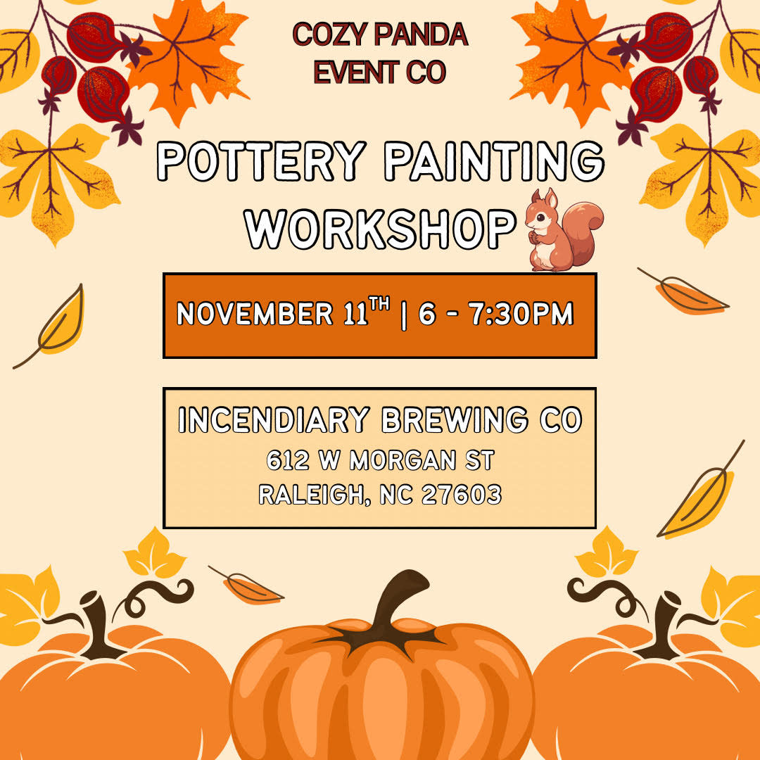 Join us at Incendiary Brewing Co for a fun and creative Painted Pottery Workshop! Perfect for all ages and skill levels, this self-guided session is great for individuals, friends, or families. Choose from a variety of ceramic pieces, including figurines and flower pots, and use the provided paints and brushes to create your own masterpiece.