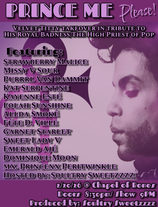 Prince Me, Please! is a one-night-only Velvet Titty takeover of Chapel of Bones honoring the legendary Prince. This immersive tribute celebrates Minneapolis funk and the art of seduction through rich purple visuals, guitar-driven grooves, and lavish style, featuring an all–Black cast of performers. Hosted and produced by Soultry Sweetzzzz, the night promises a bold, sensual celebration of the High Priest of Pop’s enduring legacy.