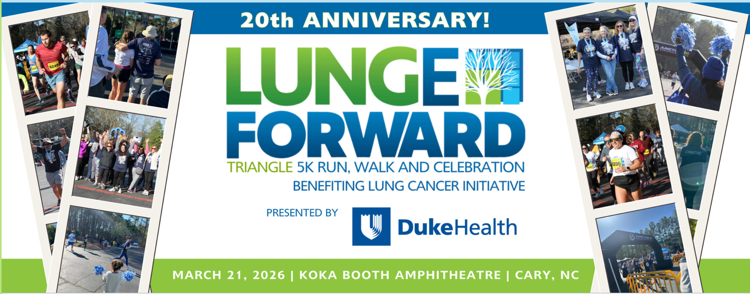 We’re thrilled to kick off a very special year — celebrating 20 years of LUNGing Forward in the Triangle. Join us at Koka Booth Amphitheatre as we commemorate this milestone and come together in support of the lung cancer community. Help make this our best year yet by forming or joining a team, fundraising, and showing up strong on event day. Every dollar and every step makes a meaningful impact on lung cancer research and support programs right here in our community.