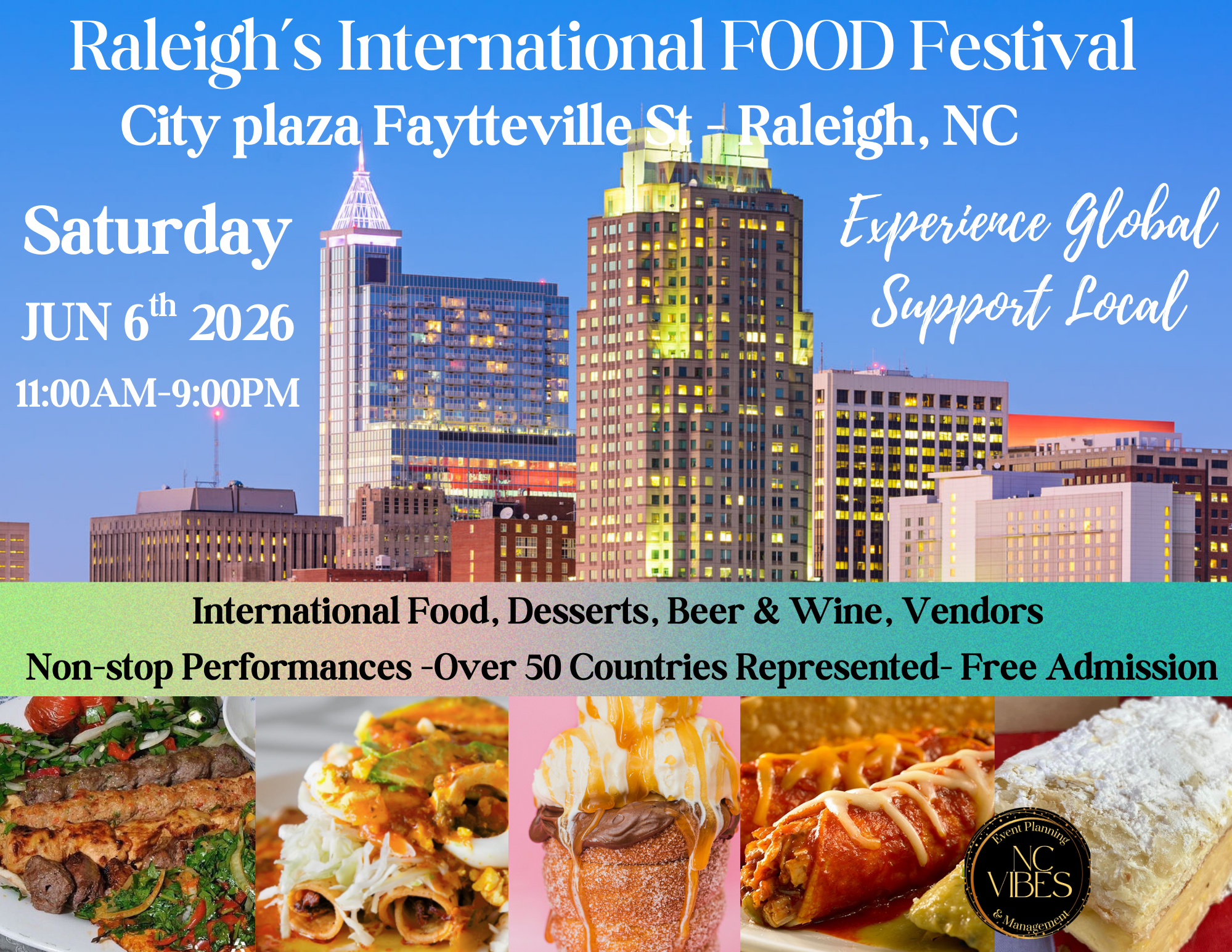 Experience: Unique international food from around the world. Vote for your favorite dish. Two stages of nonstop entertainment. Folkloric performances, live bands & international music. Beer & wine selection. Delicious desserts & sweet treats. Fun & games for all ages. Celebrate culture, community, and cuisine at a festival that brings the world to Raleigh — all with free admission.