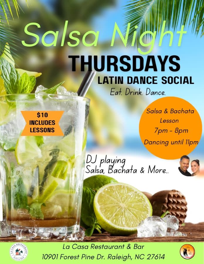 Come out to La Casa Restaurant & Rum Bar each Thurs., from 7-8pm for Salsa and Bachata lessons. Afterward, dancing will go until 11pm! $10 lesson fee.
