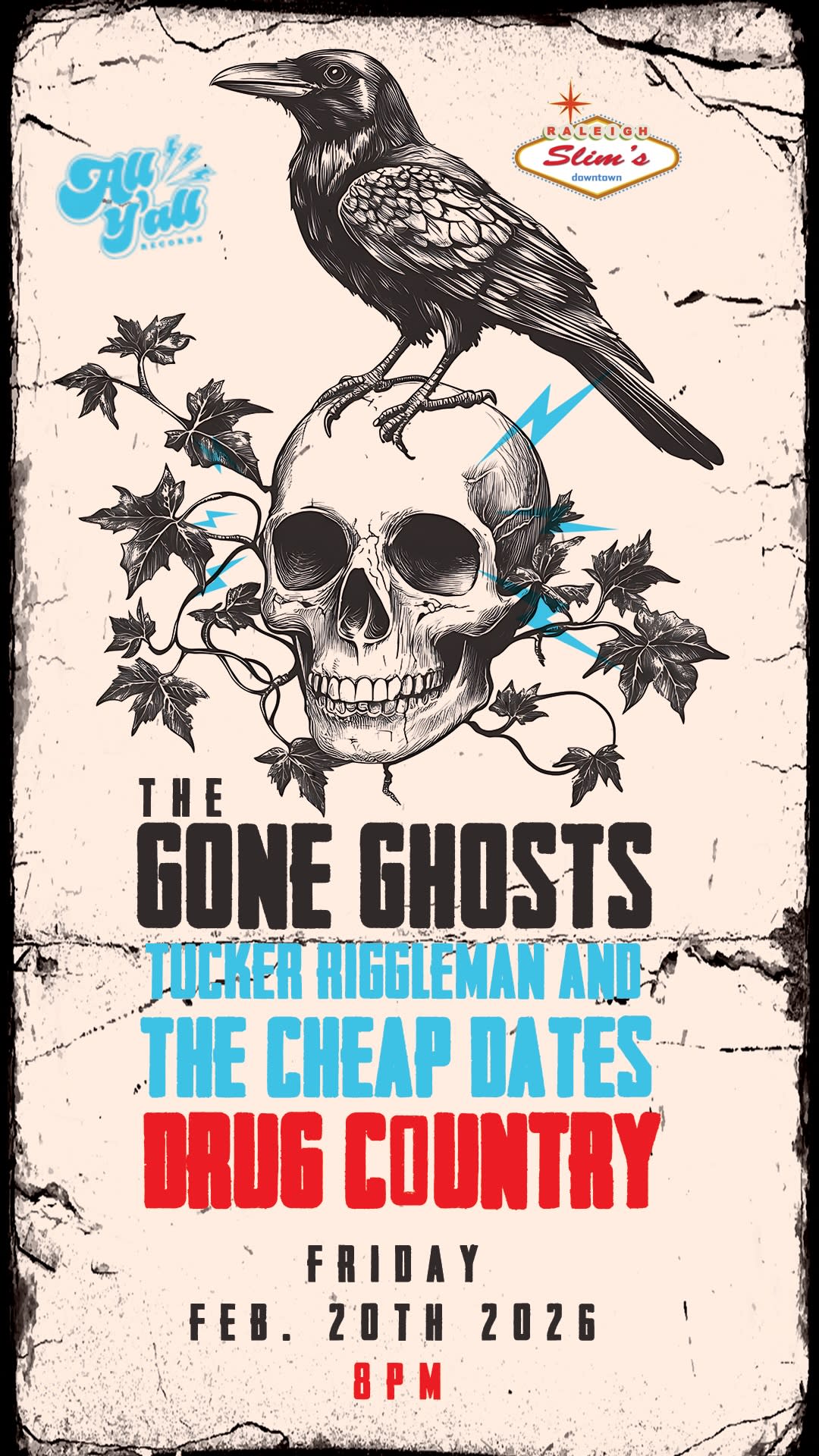 The Gone Ghosts, Tucker Riggleman and The Cheap Dates, and Drug Country are playing Slim’s on February 20th from 8-11pm! The Gone Ghosts are an alt-country Americana/rock band out of Carrboro, NC, blending raw storytelling with a sound steeped in love, loss, and heartache. Fronted by singer, guitarist, and songwriter Dave Hedeman, formerly of East Coast college favorite Puddleduck and later The Vagabond Union, the band also features bassist Dillon Partin, guitarist/vocalist Justin Bowlin, and drummer Scott Jones. Inspired by a chance encounter with Jason Isbell that reignited his passion for music, Dave formed The Gone Ghosts in 2018 to lean into the alt-country sound closest to his heart. With rootsy guitars, heartfelt lyrics, and a sound that hits somewhere between a honky-tonk and a rock club, The Gone Ghosts bring the kind of Americana grit that feels right at home on Slim’s stage. Joining the night is Tucker Riggleman and The Cheap Dates, and Drug Country!