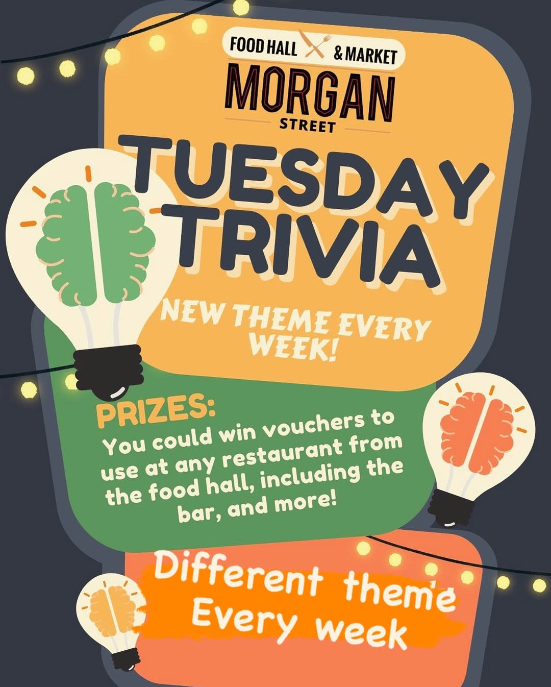 Come spend some time with Orlando and Jas every Tuesday at the Morgan Street Food Hall for a new theme every week! Enjoy food options from one of more than 19 top quality local restaurants and a drink from the Arbor Bar onsite and compete for prizes or just for a fun night out!