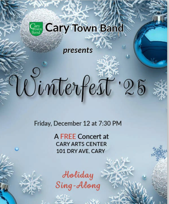 Join the Cary Town Band for our spectacular annual Winterfest concert, a joyous and uplifting musical celebration of the holiday season! This year’s event will light up the Cary Arts Center with festive music for the holidays, culminating in our cherished Christmas carol sing-along. Delight in unique and enchanting arrangements of classic seasonal tunes and let Winterfest ’25 be the unforgettable highlight that kicks off your holiday festivities!