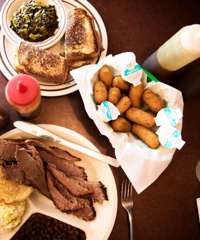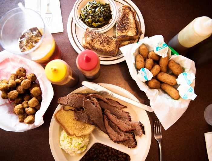 Both styles are cooked low and slow and are seasoned simply: salt and pepper, then smoke and time does the rest. Sides are similar, too, with all the things you expect to find with barbecue: slaw, beans, collards or turnip greens, hush puppies, potatoes or potato salad, macaroni and cheese and, of course, banana pudding.