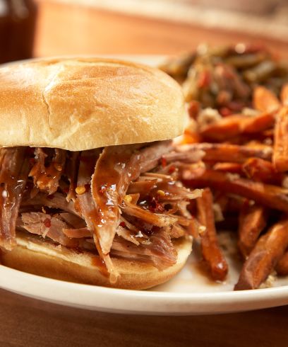 In Eastern style, we cook the whole hog over wood coals, then pull the meat, maybe give it a little chop, and dress it with sauce made from pepper flakes and vinegar. Typically, Eastern style is served as a sandwich or a plated dish.