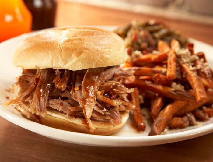 Lexington style uses only the shoulders and adds a little sweetness to that vinegar sauce by mixing in tomato paste or brown sugar. It’s chopped and served on a plate. Oak is the wood of choice with Eastern-style barbecue, where Lexington mixes oak and hickory for a more complex smoky flavor.