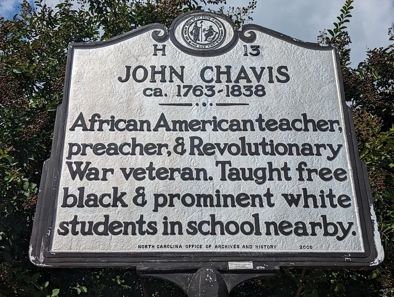 John Chavis (ca. 1762-1838) was a prominent free Black preacher and educator who settled in Raleigh around 1810 and taught children of all races from his home, near present-day Chavis Memorial Park. Chavis had fought in the Revolutionary War at the age of 16 then had gone on to study at what are now Washington & Lee and Princeton universities; he had likely the best education of any African American of his day in North Carolina. Many of his students would later become state government leaders.