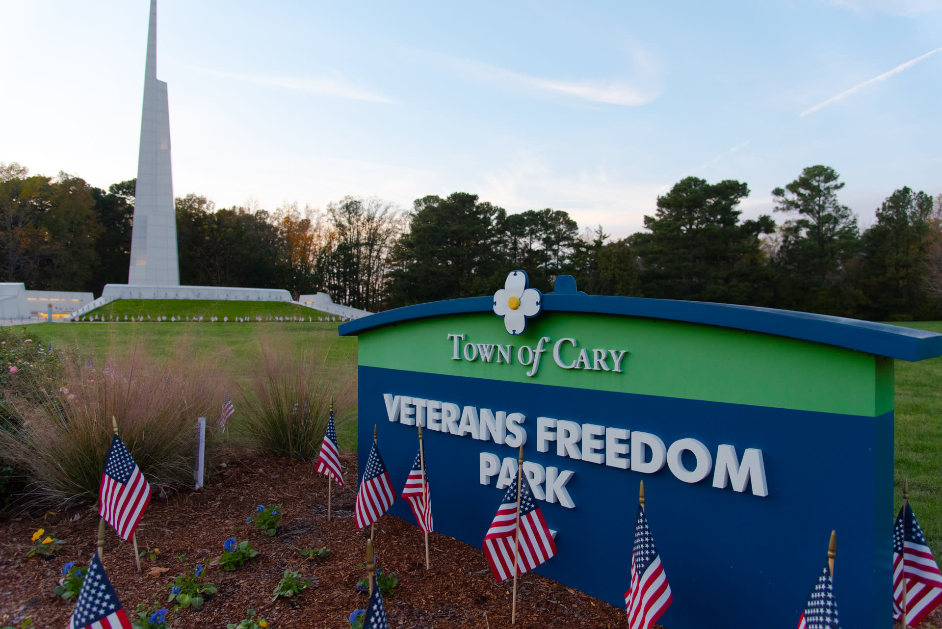 Veterans Freedom Park is a 12.6-acre park featuring a memorial court of service flags, benches and the property’s original veterans sculpture. Dominating the park space is a 90-foot white granite spire, assembled in Mt. Airy, N.C., and lined with LED lighting. The five seals from each branch of the military circle the base of the spire, creating an intimate and inviting space for reflection. The park is open daily from dawn to dusk.